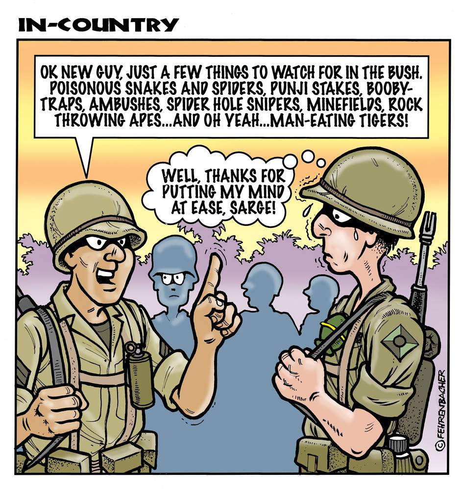 Phil enlisted in the Army in 1965 where you served for years in Vietnam.  He became a graphic designer and has worked for the state of Oregon for 26 years.  He retired in 2003 and started the Cartoon "In-Country".  The cartoons reflect his experiences during his tour of duty in South Vietnam.