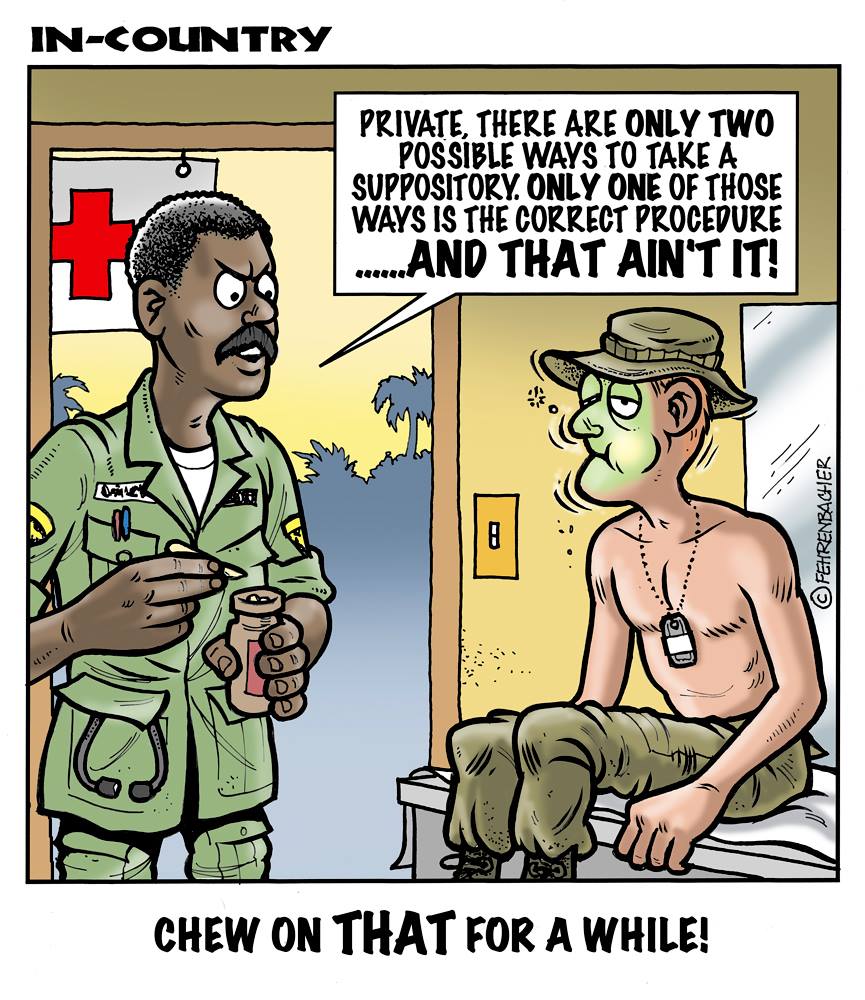 Phil enlisted in the Army in 1965 where you served for years in Vietnam.  He became a graphic designer and has worked for the state of Oregon for 26 years.  He retired in 2003 and started the Cartoon "In-Country".  The cartoons reflect his experiences during his tour of duty in South Vietnam.