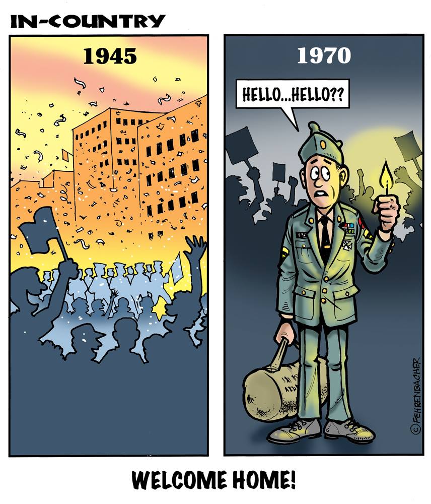 Phil enlisted in the Army in 1965 where you served for years in Vietnam.  He became a graphic designer and has worked for the state of Oregon for 26 years.  He retired in 2003 and started the Cartoon "In-Country".  The cartoons reflect his experiences during his tour of duty in South Vietnam.