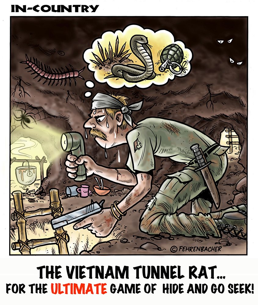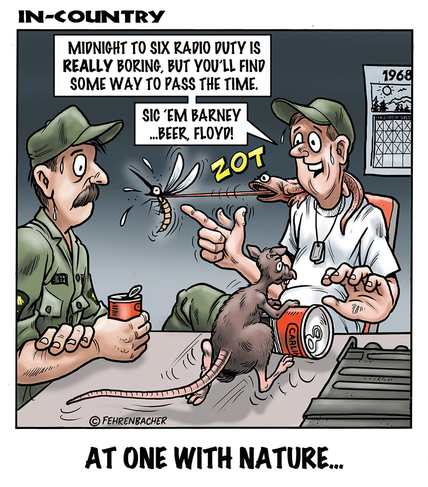 Phil enlisted in the Army in 1965 where you served for years in Vietnam.  He became a graphic designer and has worked for the state of Oregon for 26 years.  He retired in 2003 and started the Cartoon "In-Country".  The cartoons reflect his experiences during his tour of duty in South Vietnam.